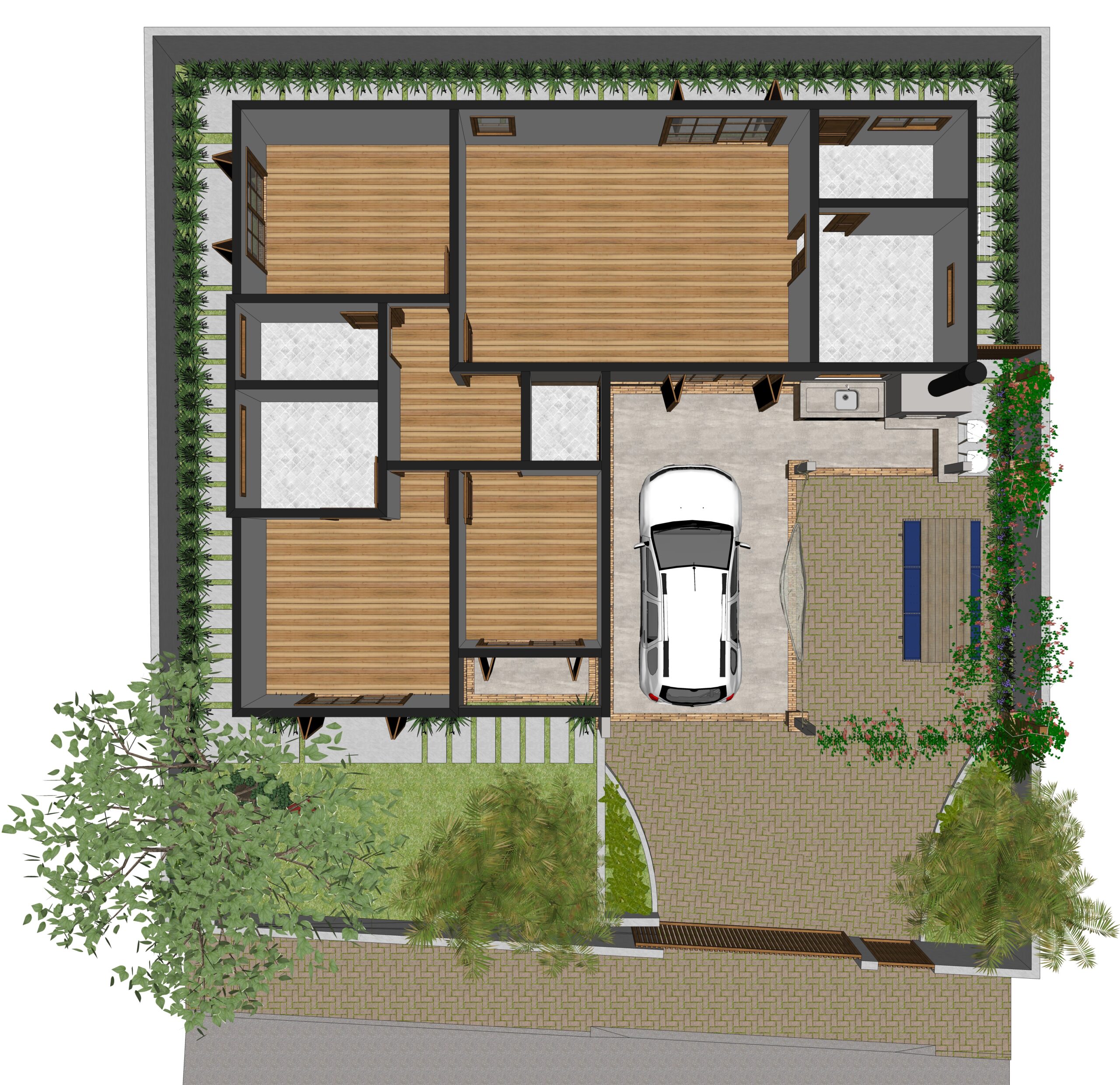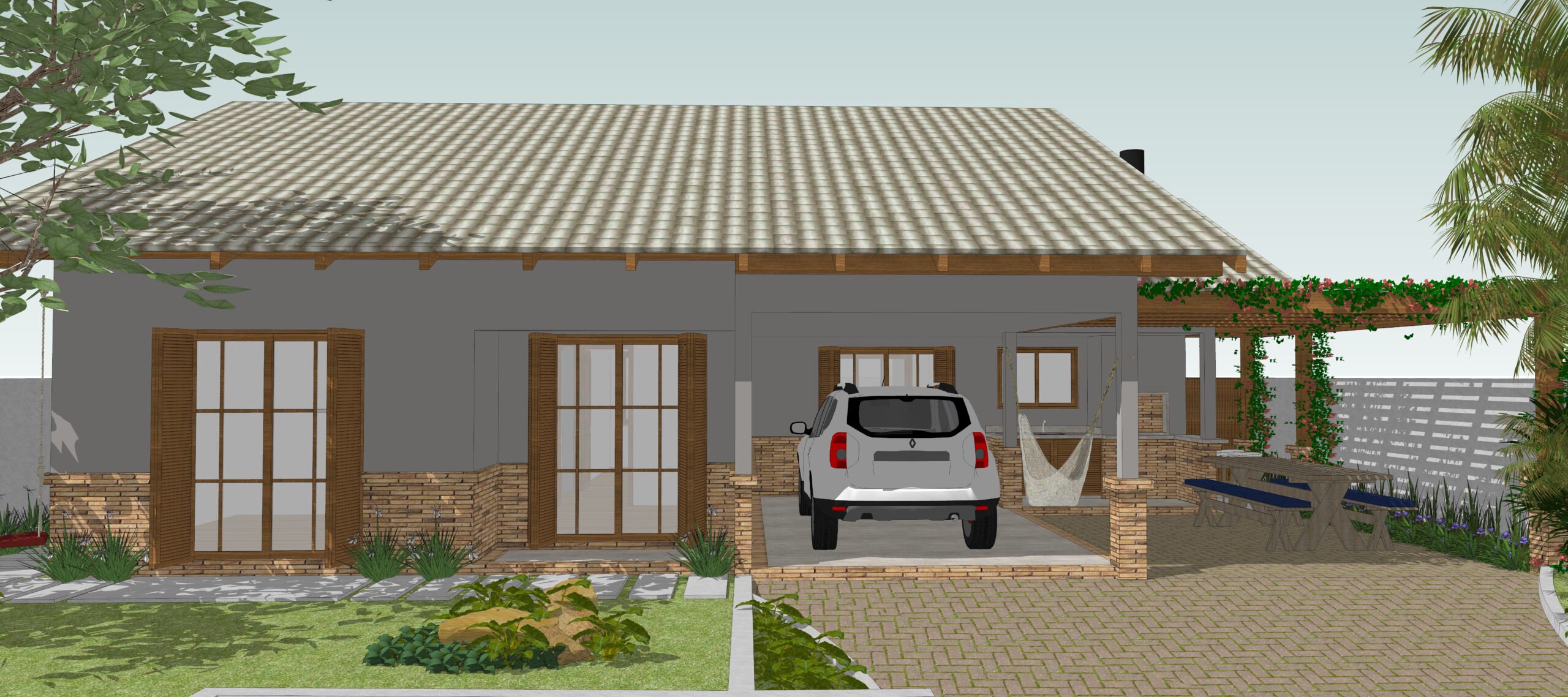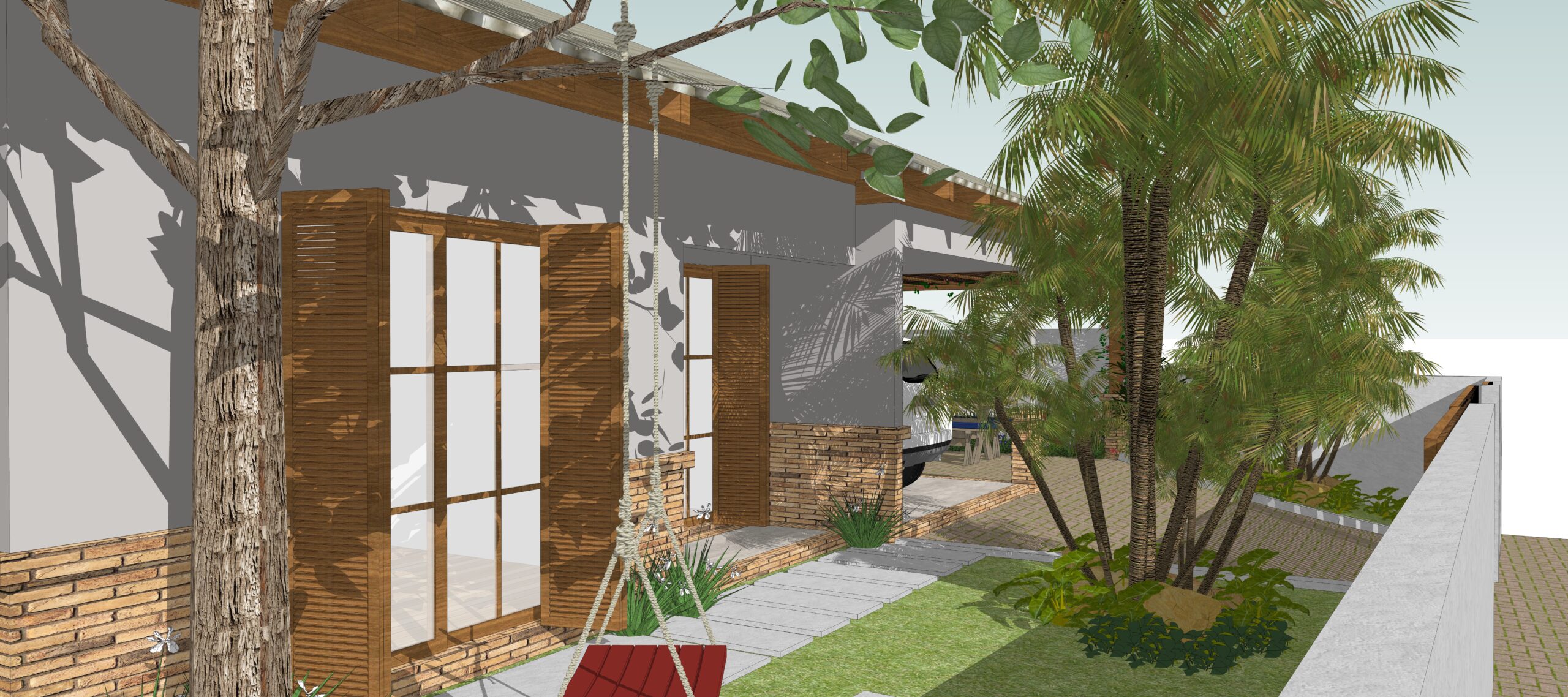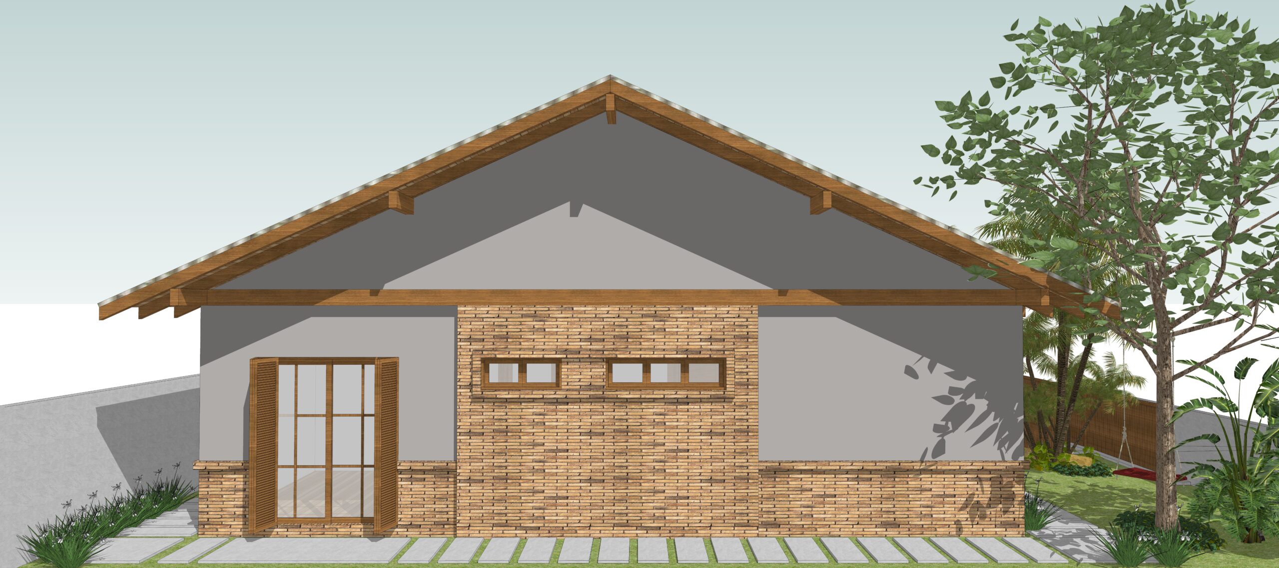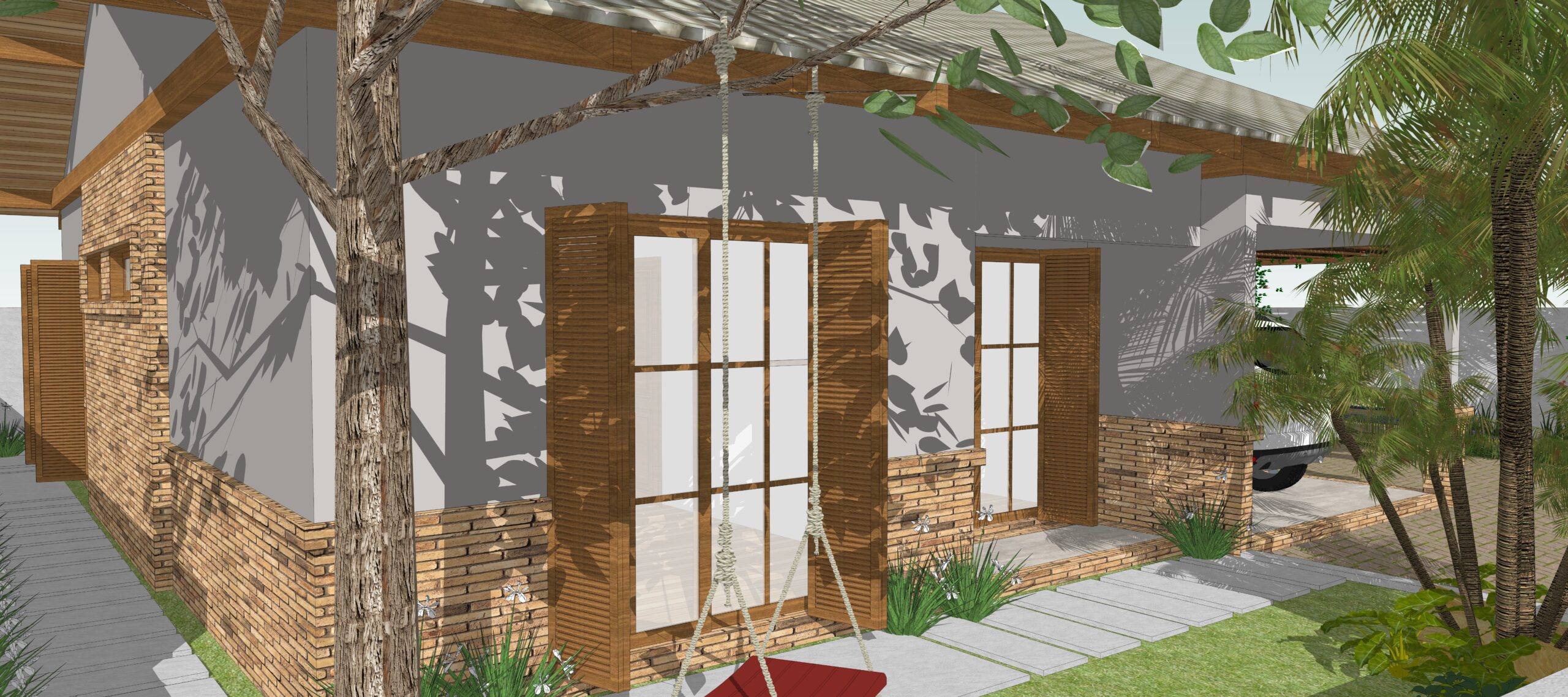 Nesse projeto ampliamos as janelas e fizemos uma mesanino para ganhar área de convivência. Na área externa optamos por ardósia.