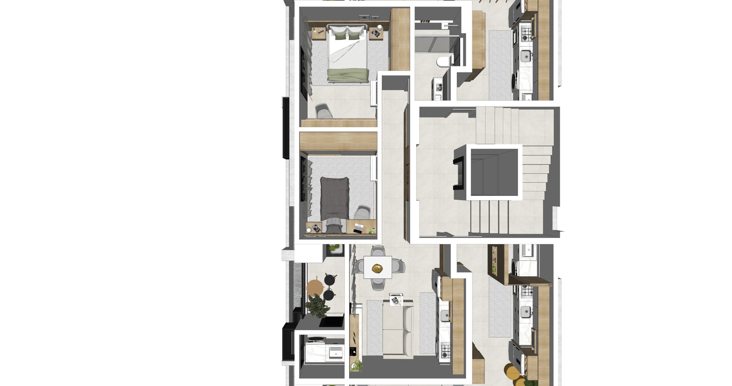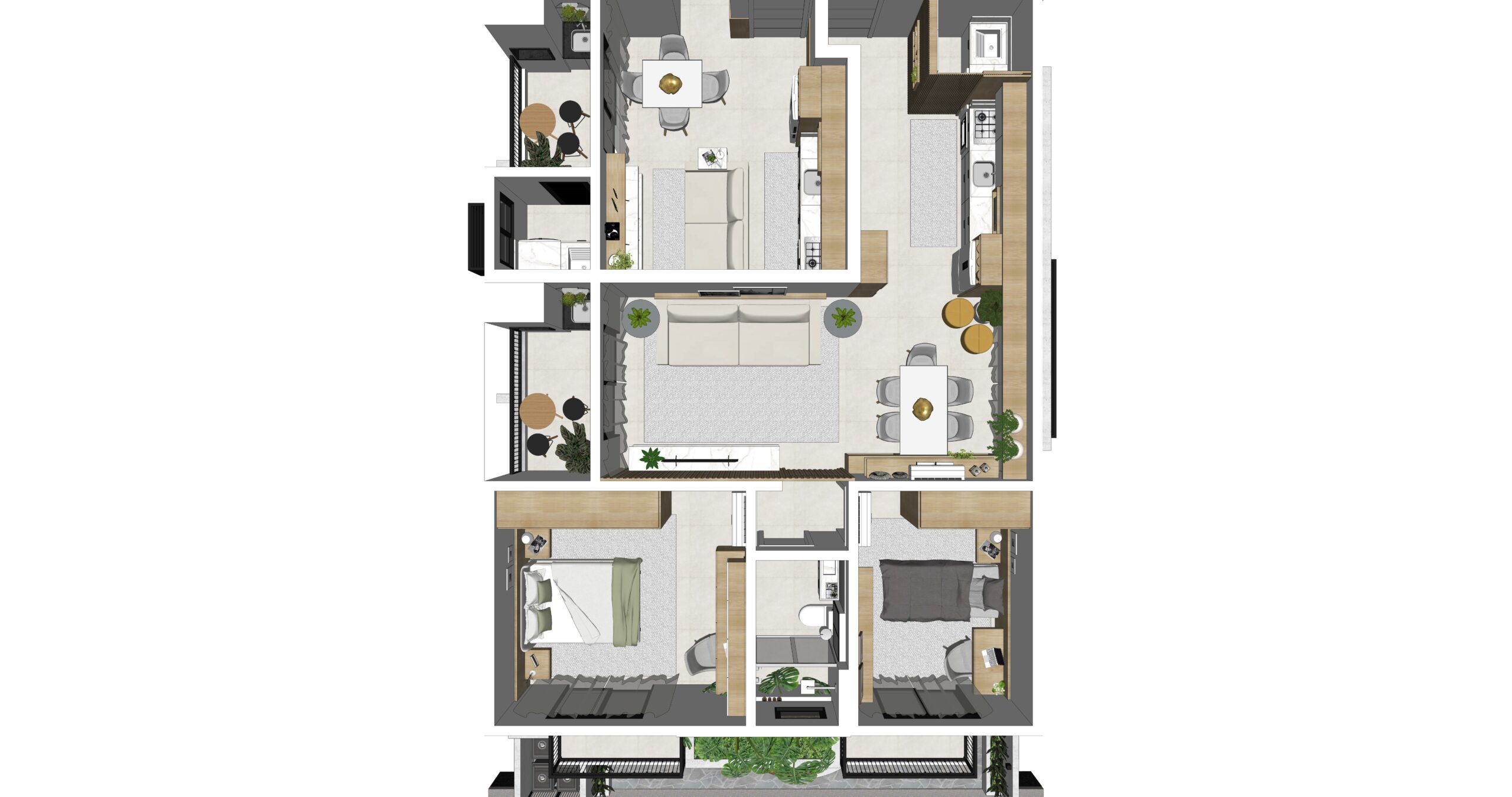 Nesse projeto ampliamos as janelas e fizemos uma mesanino para ganhar área de convivência. Na área externa optamos por ardósia.